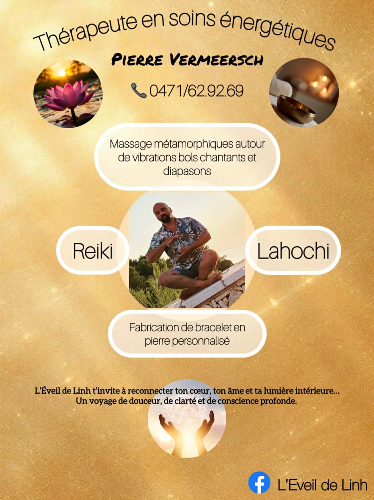 Pierre Vermeersch, fondateur de L’Éveil de Linh, accompagne celles et ceux qui ressentent le besoin de se recentrer, de retrouver un équilibre intérieur et de se reconnecter à leur essence, dans un espace de douceur, de présence et de conscience.